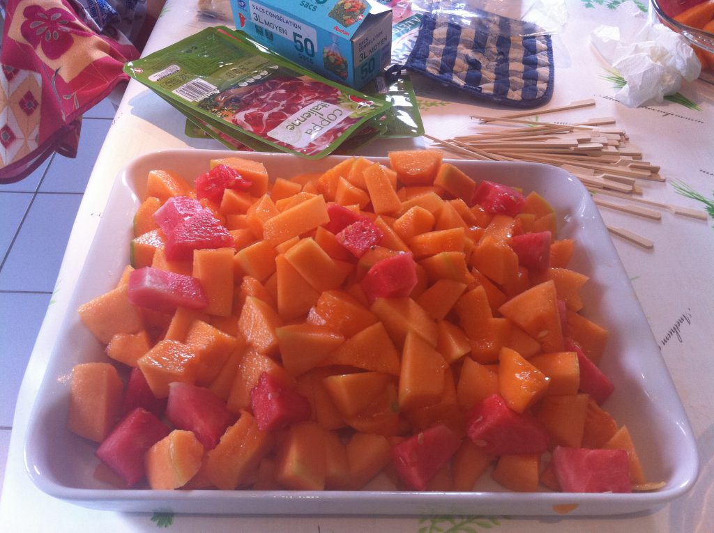 - Cubes de Pastèque présentés mélangés à des cubes de melon