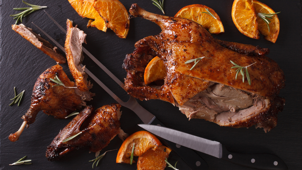 - Brider les de manière classique ou demandez à votre volailler de le faire. Si vous avez pu conserver les feuilles des oranges, mettez-en 2 ou 3 à l’intérieur des canards, puis salez et poivrez intérieurement les volailles.