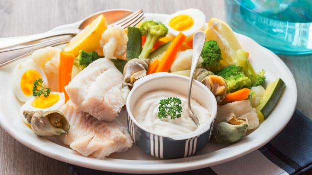 Disposer la morue, les escargots, les oeufs durs coupés en deux dans la longueur, sur un grand plat de service. Les entourer de tous les légumes.