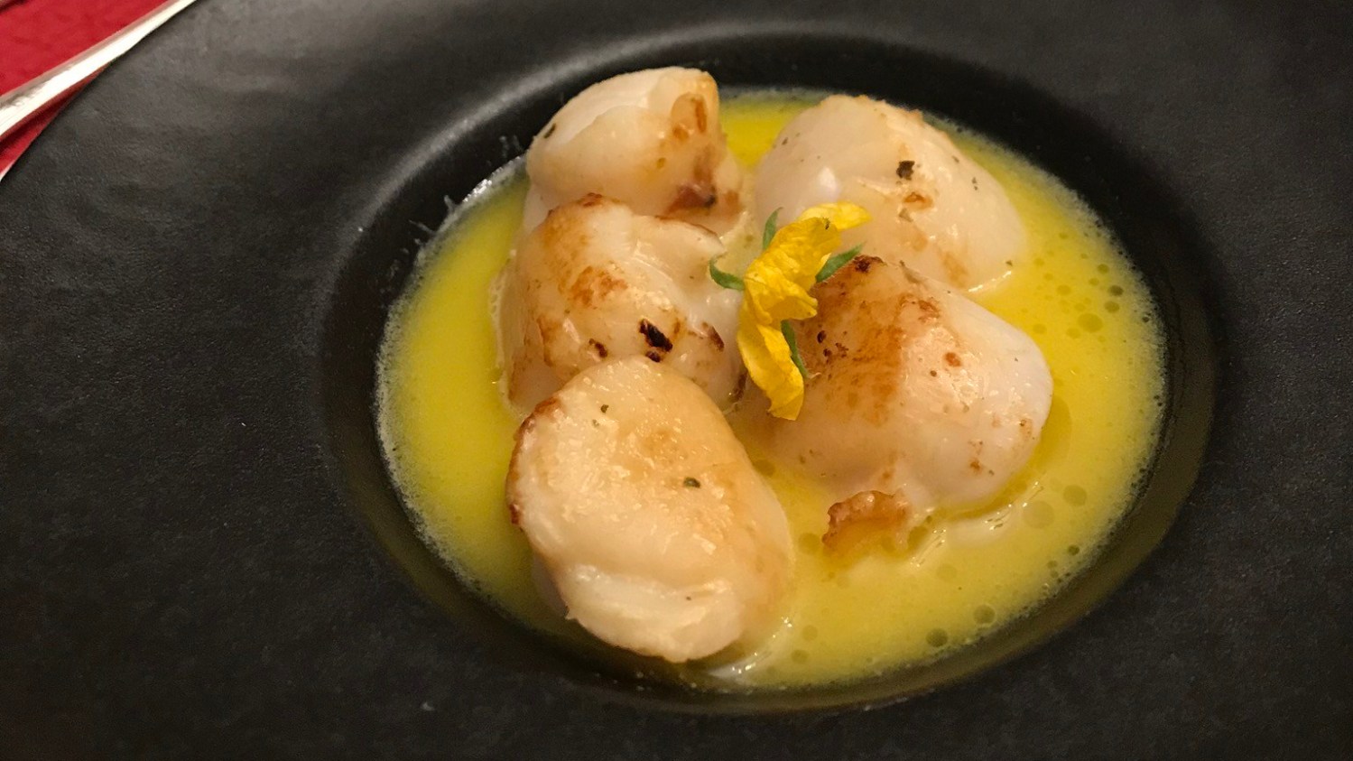 Frédéric Anton (Le Pré Catelan, Paris) propose « La Saint-Jacques au plat, jus de pomme à cidre, noix écrasées et torréfiées »
