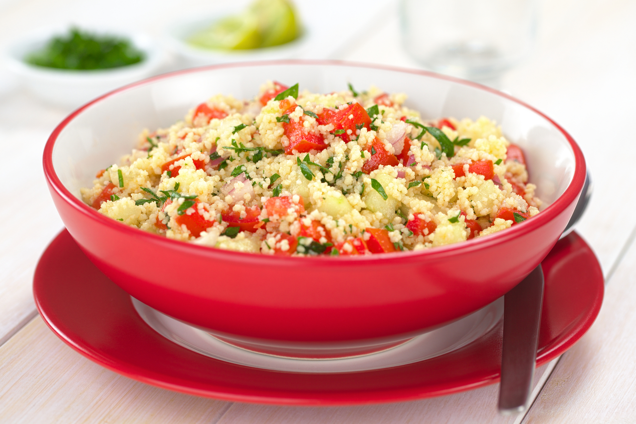 Lavez les tomates et coupez les en cubes d’environ 1,5 cm. Épluchez le concombre, coupez-les en dés de la même grosseur. Faites de même avec la courgette. Épluchez les oignons et émincez-les finement à la mandoline. Ajoutez le tout au couscous et mélangez délicatement. Rectifiez l’assaisonnement et réservez au frais.