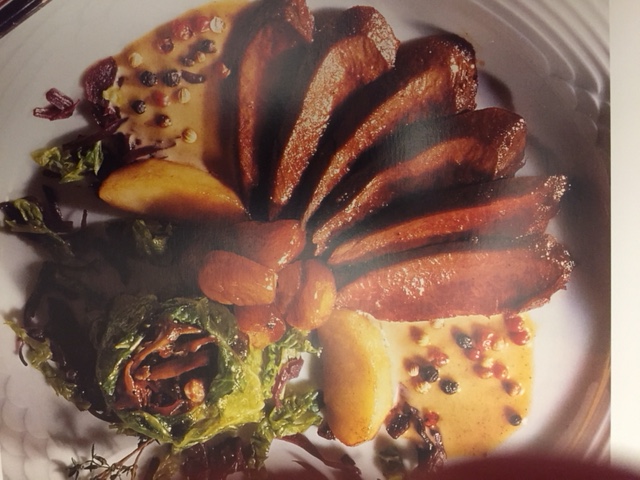 - râbles de lièvre en éventail, 2 quartiers de pomme, un petit chou farçi et quelques châtaignes confites. Traits de sauce, le reste en saucière.