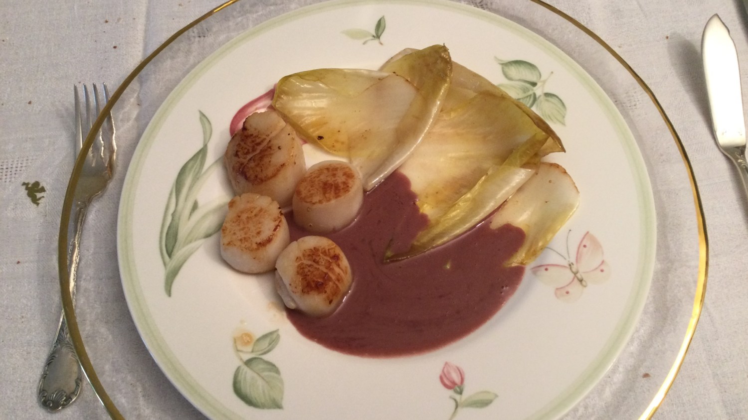 - Dressez les endives au centre de l’assiette, posez trois noix de saint-jacques dessus. Nappez avec la sauce autour des endives. Parsemez la julienne de citron vert.