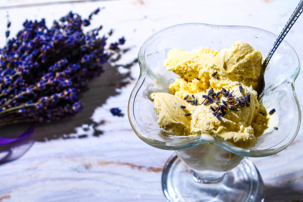 Faites fondre ce sucre de lavande dans le lait. Mélangez les jaunes avec la crème légère. Ajoutez le lait sucré, mélangez et passez le tout à la sorbetière.