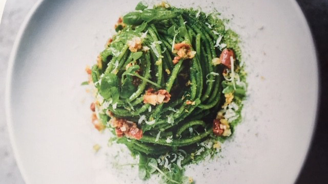 Mettez le pesto dans une poêle et faites chauffer à feu doux. Egouttez les pâtes en conservant l’eau de cuisson et déposez-les dans la pôele. Ajouter une louche d’eau de cuisson et mélangez pendant 1-2 mn. Les pâtes doivent être baveuses.