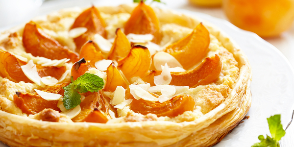 Pâte feuilletée et crème à l’amande composent cette tarte aux abricots caramélisés recouverts d’un nappage abricot.