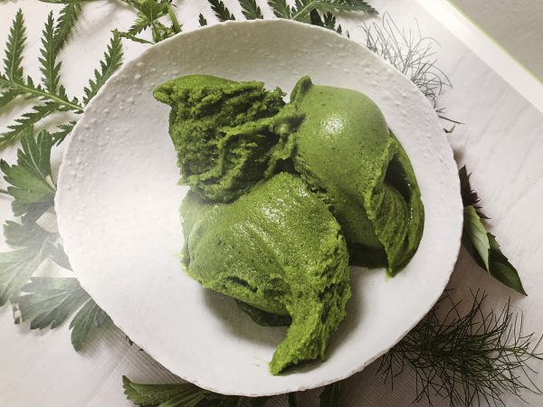 Faites un sirop avec tous les ingrédients. Mettez à bouillir durant 1 minute et laissez refroidir. Dans le sirop froid, mixez toutes les herbes. Ne filtrez pas.