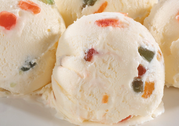 Cette crème est mise à glacer et lorsqu’elle est encore bien souple, on lui incorpore les fruits confits marinés et égouttés.