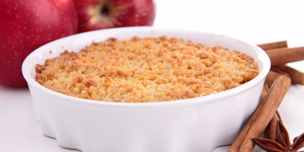 Versez les pommes dans un plat à gratin. Parsemez-les de crumble. Glissez dans le four et laissez cuire 25 minutes. Servez tiède avec une coupelle de crème.