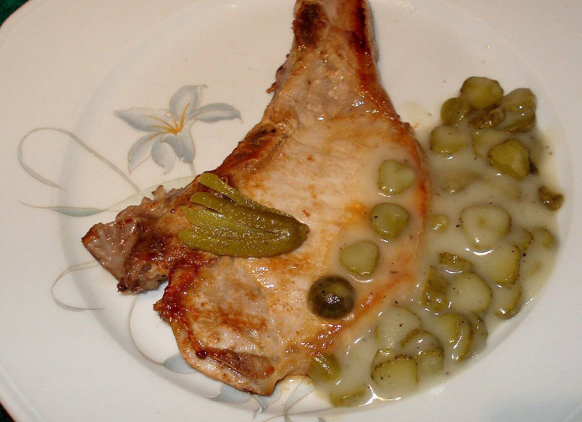 Découper la côte de porc en quatre morceaux et accompagnez la d’une purée de pommes de terre. Déposer un cordon de sauce charcutière à côté de la purée.
