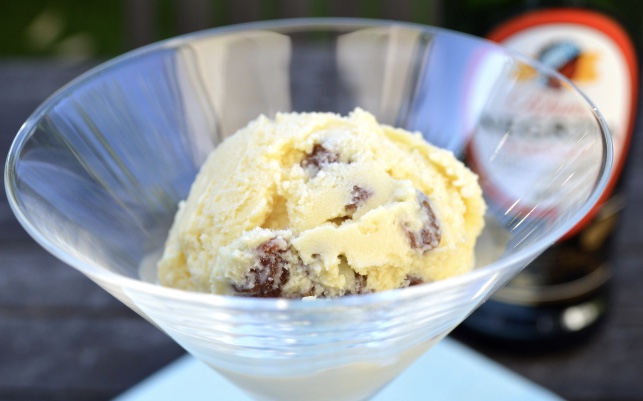 Verser la crème refroidie en sorbetière, ajouter la crème fleurette et le rhum puis, en fin de turbinage, au dernier moment, les raisins macérés égouttés.