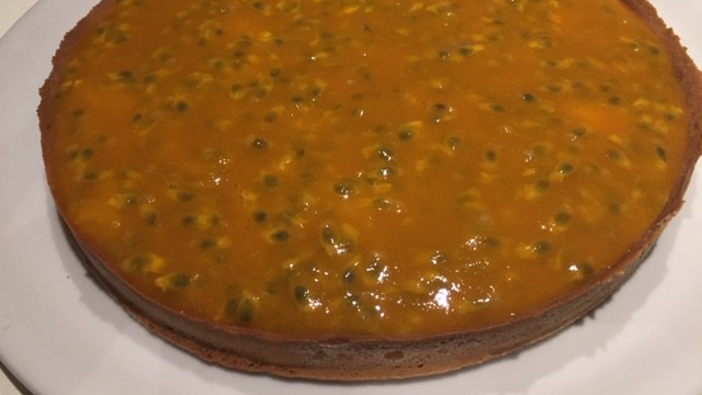 Dans le fond de tarte refroidi, verser l’appareil à flan à 1 cm du bord. Déposer par- dessus la gelée de fruits de la passion.Servir.