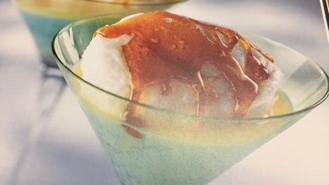 Préparez le caramel. Posez les blancs cuits sur la crème et versez dessus le caramel chaud en mince filet. Mettez au frais.