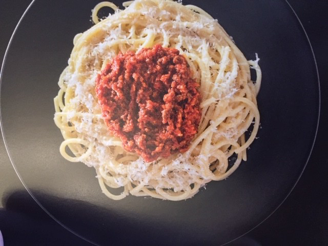 Dans une poële, faire revenir l’oignon haché finement avec un filet d’huile d’olive. Ajouter la viande hachée et faire cuire l’ensemble. Verser la sauce tomate par-dessus et laisser mijoter sur le coin du feu pendant une vingtaine de minutes.