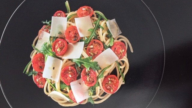 Dans une casserole, lier les pâtes avec de l’huile d’olive et le parmesan râpé. Faire poêler à l’huile d’olive les tomates cerises coupées en deux, assaisonner de sel et poivre, mélanger le tout. Ajouter la roquette au dernier moment et rectifier l’assaisonnement.