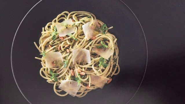 Torréfier les pignons de pin au four pendant 5 minutes. Laisser refroidir. Dans un mixer, rassembler le basilic, l’ail, les pignons de pin torréfiés, le parmesan et l’huile d’olive. Lier les spaghetti avec ce pesto, rectifier l’assaisonnement.
