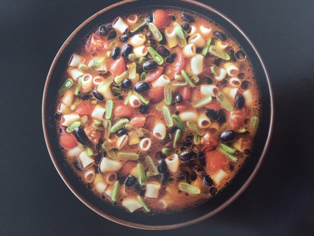 Faire revenir l’oignon ciselé finement et la gousse d’ail dans de l’huile d’olive. Ajouter les tomates cerises coupées en quatre et les haricots coco noirs cuits. Mouiller avec le bouillon de volaille , porter à ébullition, puis incorporer les pôis gourmands coupés en sifflets et les petits macaroni cuits. Laisser mijoter pendant quelques minutes.
