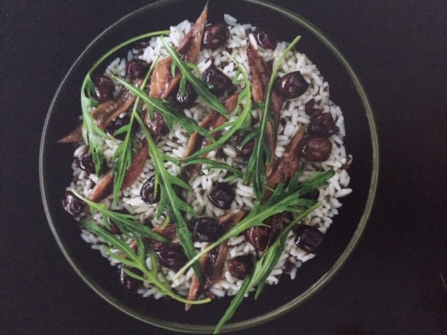 Mélanger bien. Hacher les olives noires, puis les incorporer à la salade de riz avec les niçoises entières et les filets d’anchois. Mélanger et rectifier si nécessaire l’assaisonnement. Ajouter de la vinaigrette sur la roquette. Dresser le riz dans un saladier et déposer dessus les feuilles de roquette. Servir rapidement.