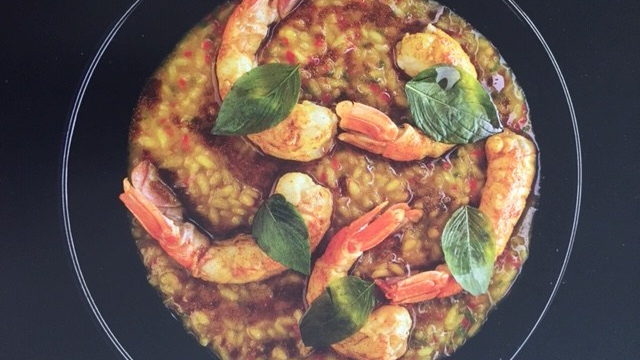 A la fin de la cuisson, incorporer le parmesan râpé. Monter avec l’huile d’olive restante, ajouter le jus de volaille chaud, puis rectifier l’assaisonnement. Pour la garniture, commencer par décortiquer les langoustines et retirer le boyau. Les saler et les poivrer, puis les poêler 2 minutes de chaque côté dans de l’huile d’olive chaude avant de les égoutter. Rectifier l’assaisonnement. Dresser le risotto au fond des assiettes. Déposer les langoustines dessus et garnir de feuilles de basilic thaï. Finir avec un filet d’huile d’olive. Servir.