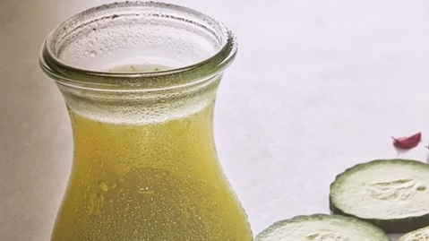 Le jour même, éplucher le concombre, le passer à la centrifugeuse afin d’en extraire 40 cl de jus. Mélanger tous les éléments et verser en carafe.