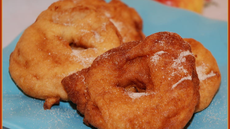 Préparez la pâte à beignets et laissez la reposer 1 heure. Épluchez les pommes et, avec un vide-pomme, ôtez le cœur, puis coupez les en tranches assez épaisses. Faites chauffer l’huile à 175°C. Mélangez la moitié du sucre avec la cannelle dans une assiette. Plongez chaque rondelle de pomme d’abord dans le sucre parfumé à la cannelle, en insistant suffisamment pour que le sucre y adhère bien. Piquez ensuite chaque rondelle sur une longue fourchette , trempez la dans la pâte et plongez-la ensuite dans friture chaude. Avec une écumoire, retournez les beignets pour qu’ils dorent bien de tous les cotés. Ôtez les de la friture et déposez les sur du papier absorbant. Mettez les beignets sur le plat de service et poudrez-les de sucre. Servez les aussitôt.