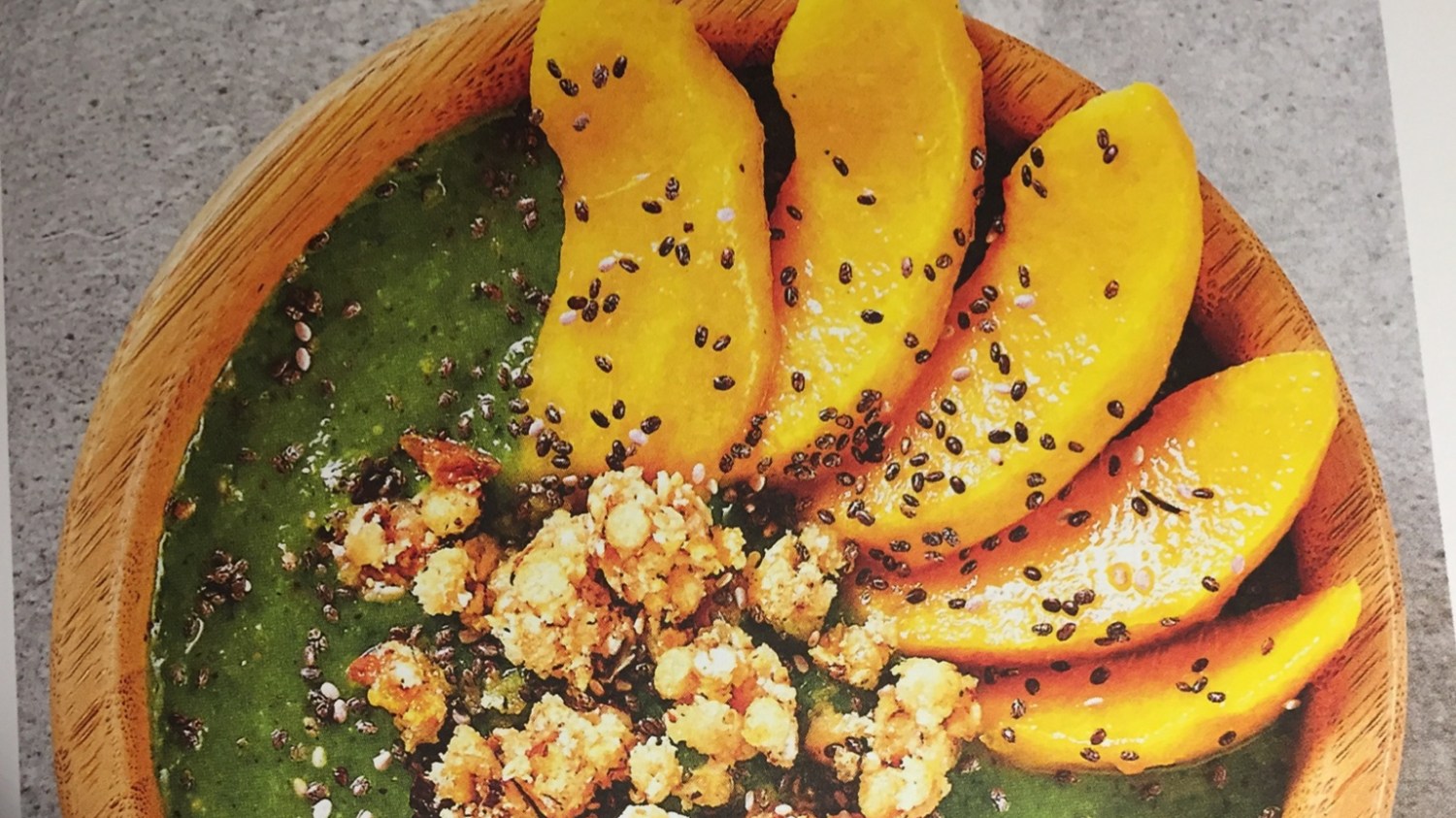 Ajoutez les lamelles de mangue et parsemez de granola et de graines de chia.