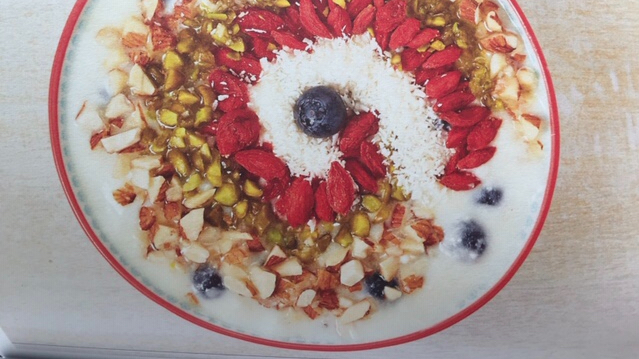 Dans un saladier, mélangez le yaourt, le sirop d’agave et les myrtilles. Versez la préparation dans un bol. Décorez avec les autres ingrédients en les disposant en spirale sur le dessus.
